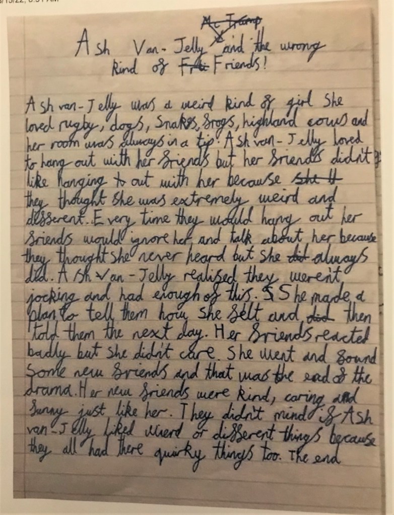 Ash Van Jelly was a weird kind of girl. She loved rugby, dogs, snakes, frogs, highland cows and her room was always in a tip. Ash Van Jelly loved to hang out with her friends but her friends didn't like to hang out with her because they thought she was extremely weird and different. Every time they would hang out her friends would ignore her and talk about her because they thought she never heard but she always did! Ash Van Jelly realised they weren't joking and had enough of this. She made a plan to tell them how she felt and then told them the next day. Her friends reacted badly but she didn't care. She went and found some new friends and that was the end of the drama. Her new friends were kind, caring and funny just like her. They didn't mind if Ash Van Jelly liked weird and different things because they all had their quirky things too. The End.