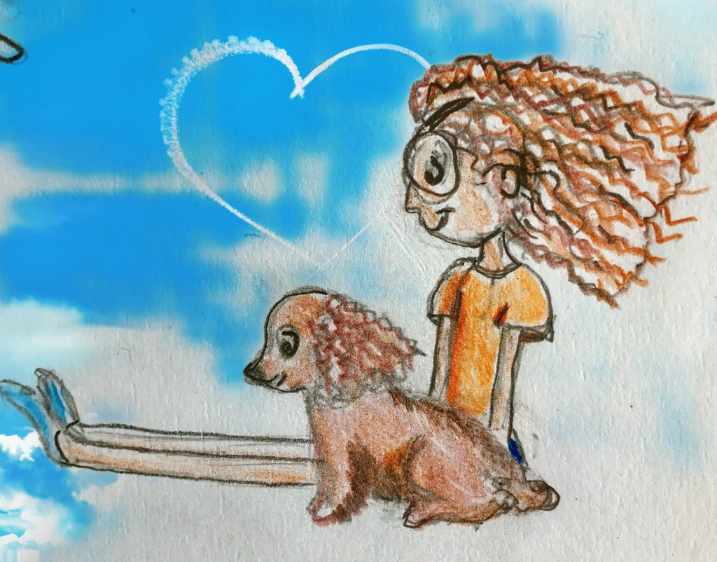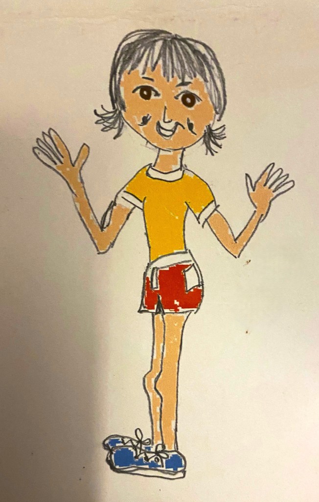 What we don’t really know is what Pixie looks like from reading the text. I was asked by my publisher, Austin Macauley, if I had any ideas about what Pixie might look like and I came up with this above – based on what my daughters were wearing at the time. What actually happened was that the publisher produced all the illustrations including those of Pixie and they created her with her trademark curly red hair and round glasses, T-shirt, shorts and the red cape.