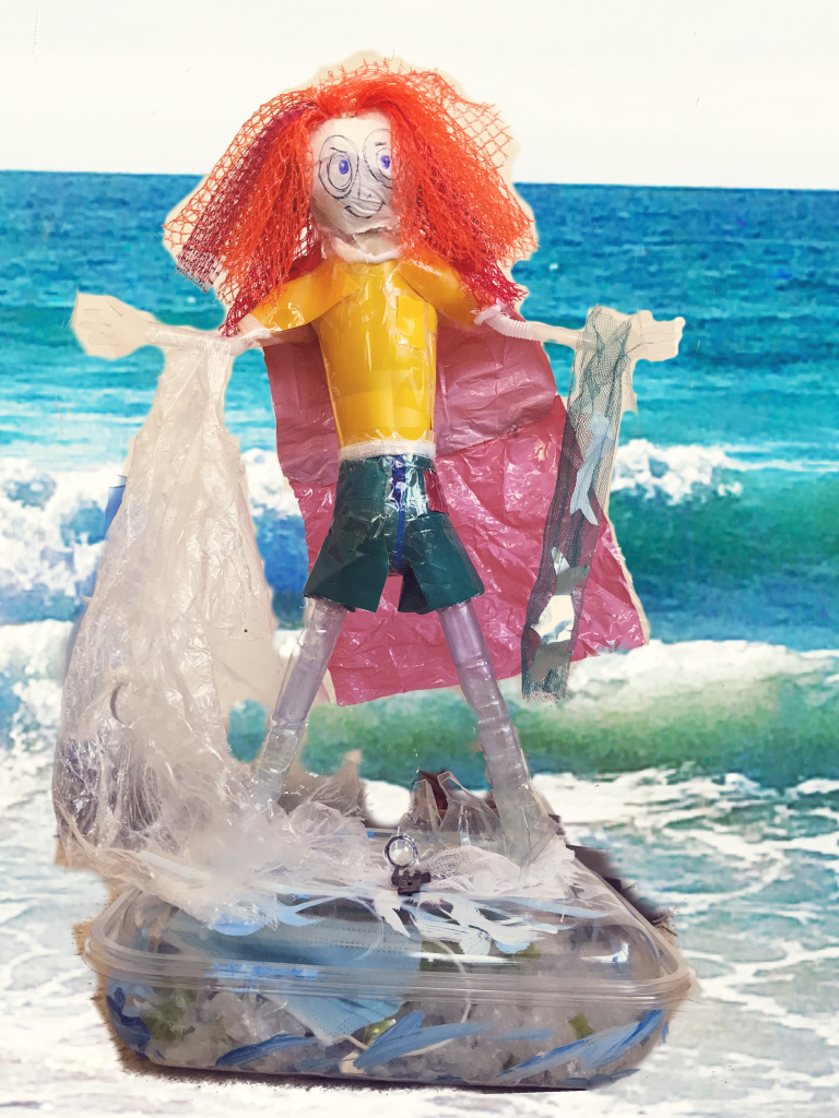 We wanted to reintroduce ‘Polymer Pixie’ again to remind ourselves that plastics can be reused and to demonstrate that there is ALOT of it! I made Polymer Pixie from used plastic bottles, containers and plastic bags, fruit packaging and even put in a couple of face masks we had during Covid-19, as much of that plastic waste was flying around all over the place and ended up in rivers and waterways, ending up in the sea. A vast amount of it, including protective gloves and aprons, was burnt, causing CO2 emissions – so not good for the environment.